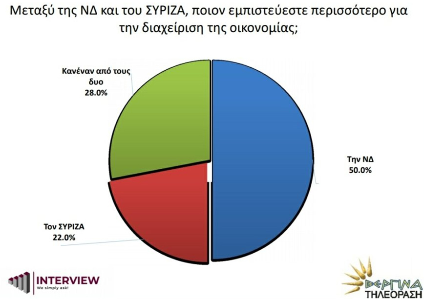 Πρωτιά σημειώνεται και στη Νέα Δημοκρατία στη διαχείριση της οικονομίας (50%), ενώ την ίδια στιγμή η πλειοψηφία ζητά άρση του Lockdown (57%) και κατάργηση των SMS.
