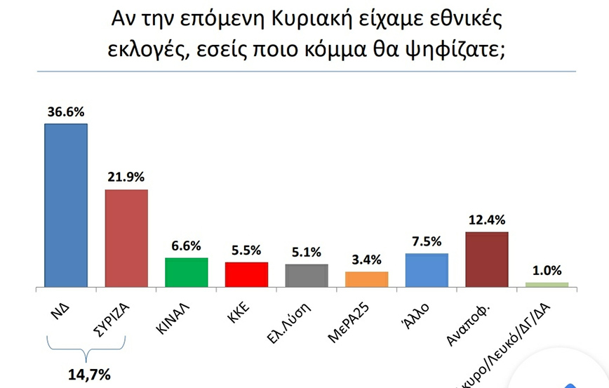Σύμφωνα με την αξιολόγηση των πολιτών και την καταγραφή των απόψεών τους το 36,6 % εξακολουθεί να εμπιστεύεται την Κυβέρνηση Μητσοτάκη και θα την ψήφιζε εάν την ερχόμενη Κυριακή είχαμε εκλογές. Με διαφορά 14,7% από τη ΝΔ, τον ΣΥΡΙΖΑ εμπιστεύεται το 21,9%. Τρίτο στη σειρά παραμένει σταθερά το ΚΙΝΑΛ με ποσοστό 6,6%, ακολουθεί το ΚΚΕ με 5,5%, η Ελληνική Λύση με 5,1% και το ΜεΡΑ25 3,4%
