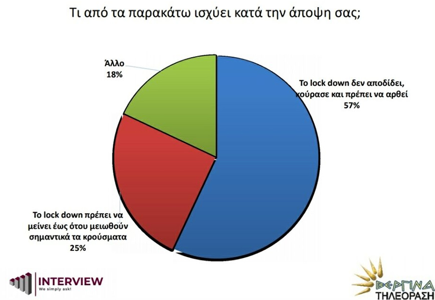 Παράλληλα το 57% υποστηρίζει ότι το lockdown δεν αποδίδει, κούρασε και πρέπει να αρθεί.