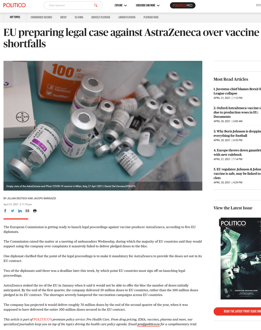 Σε συνεδρίαση που είχαν χθες Τετάρτη Ευρωπαίοι διπλωμάτες, η πλειονότητα των χωρών της ΕΕ δήλωσε ότι θα στήριζε μια προσφυγή κατά της φαρμακοβιομηχανίας για τις καθυστερήσεις στην παράδοση των δόσεων του εμβολίου της κατά της covid-19 στην Ένωση, όπως αναφέρει το Politico και αναμεταδίδει το ΑΜΠΕ.