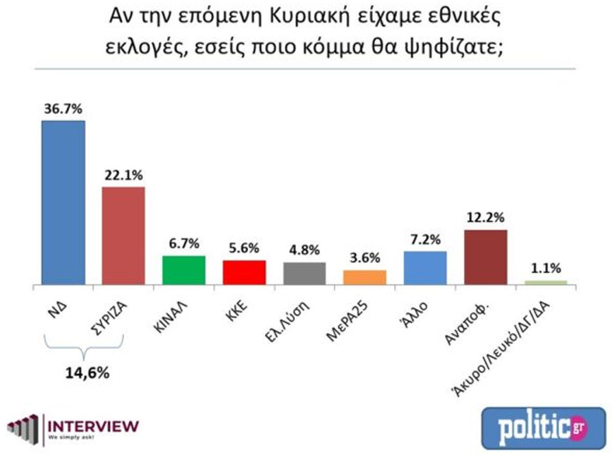Ισχυρό προβάδισμα 14,6% για τη ΝΔ στην πρόθεση ψήφου καταγράφει πανελλαδική δημοσκόπηση της Interview που πραγματοποιήθηκε για λογαριασμό του Politic.gr.