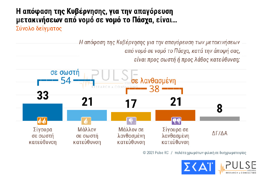 Για την απαγόρευση μετακινήσεων από νομό σε νομό το Πάσχα, το 54% θεωρεί πως η απόφαση είναι στη σωστή κατεύθυνση, ενώ το 38% θεωρεί πως είναι λανθασμένη, με το 8% να απαντάει δεν γνωρίζω/δεν απαντώ.