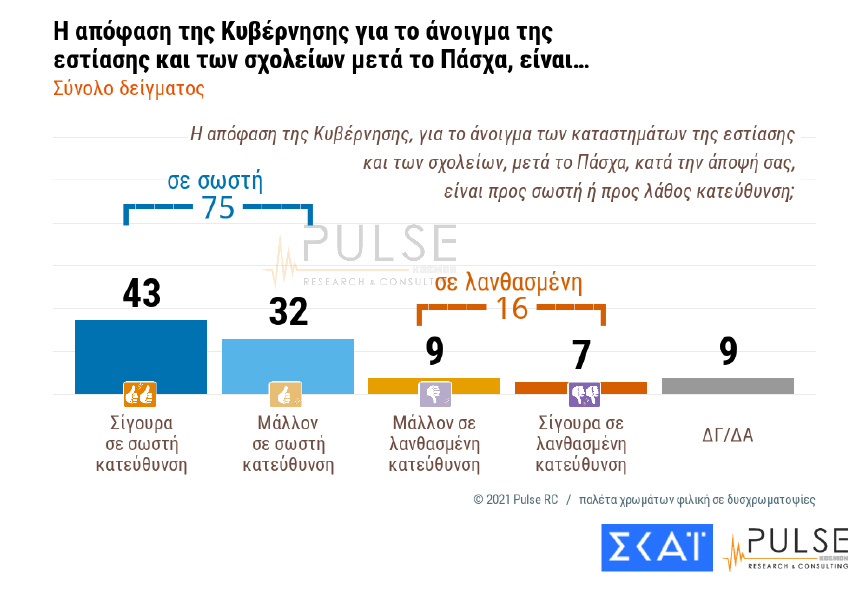 Για το άνοιγμα της εστίασης και των σχολείων μετά το Πάσχα, το 75% θεωρεί πως είναι σωστή η απόφαση, έναντι του 16%.