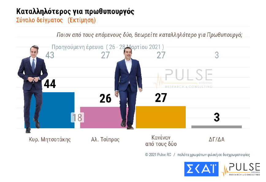 Καταλληλότερος για πρωθυπουργός συνεχίζει να είναι ο Κυριάκος Μητσοτάκης με 44%, έναντι 26% του Αλέξη Τσίπρα, ενώ ο «κανένας από τους δύο» συγκεντρώνει το ποσοστό του 27%.