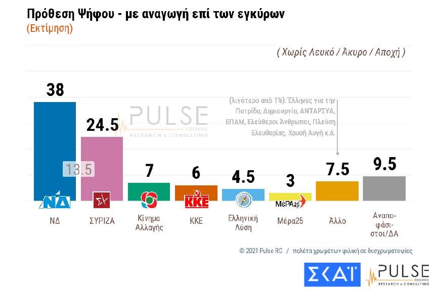 Στη δημοσκόπηση της Pulse για τον ΣΚΑΪ η διαφορά της ΝΔ με τον ΣΥΡΙΖΑ διαμορφώνεται στις 13,5 μονάδες, ενώ οι πολίτες απάντησαν σε μία σειρά από ερωτήματα για τον κορονοϊό.