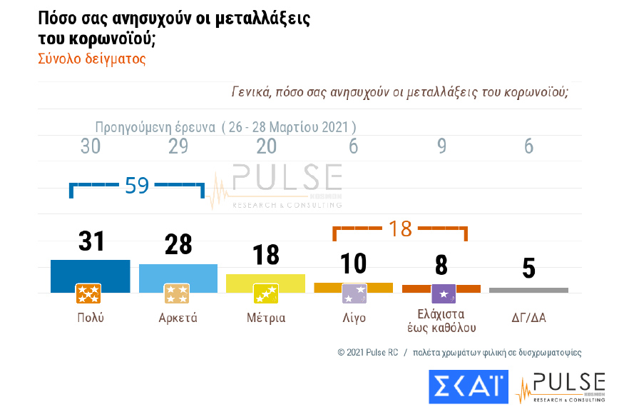 Στην ερώτηση «πόσο σας ανησυχούν οι μεταλλάξεις του κορονοϊού», το 59% απάντησε πως ανησυχεί, το 18% ανησυχεί μέτρα, ενώ το 18% ανησυχεί λίγο ή ελάχιστα.