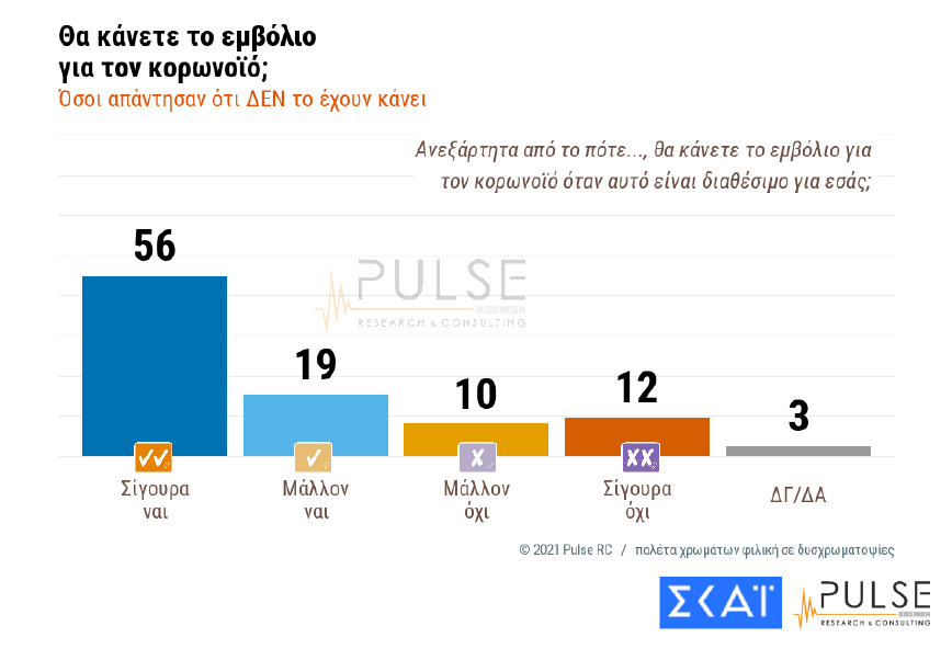 Στο ερώτημα αν θα κάνουν το εμβόλιο του κορονοϊού, το 56% απάντησε σίγουρα ναι, το 19% μάλλον ναι, το 10% μάλλον όχι και το 12% σίγουρα όχι. Παράλληλα, το 56% θα το κάνει το συντομότερο, το 13% απάντησε πως θα εμβολιαστεί μετά από 2-3 μήνες, το 16% αρκετά αργότερα και το 13% ποτέ.