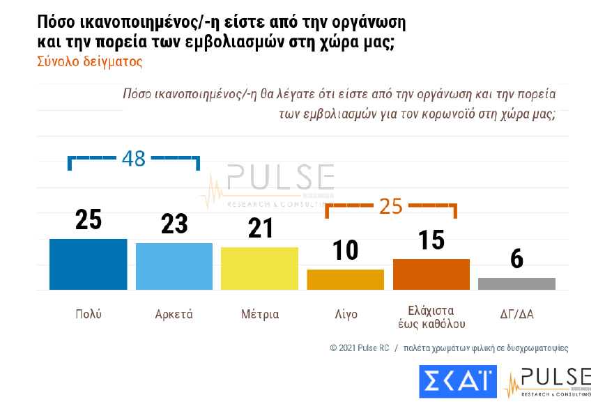 Όσο για την ικανοποίηση από την οργάνωση των εμβολιασμών, το 48% είναι ικανοποιημένο, σε αντίθεση με το 25% που δεν είναι.