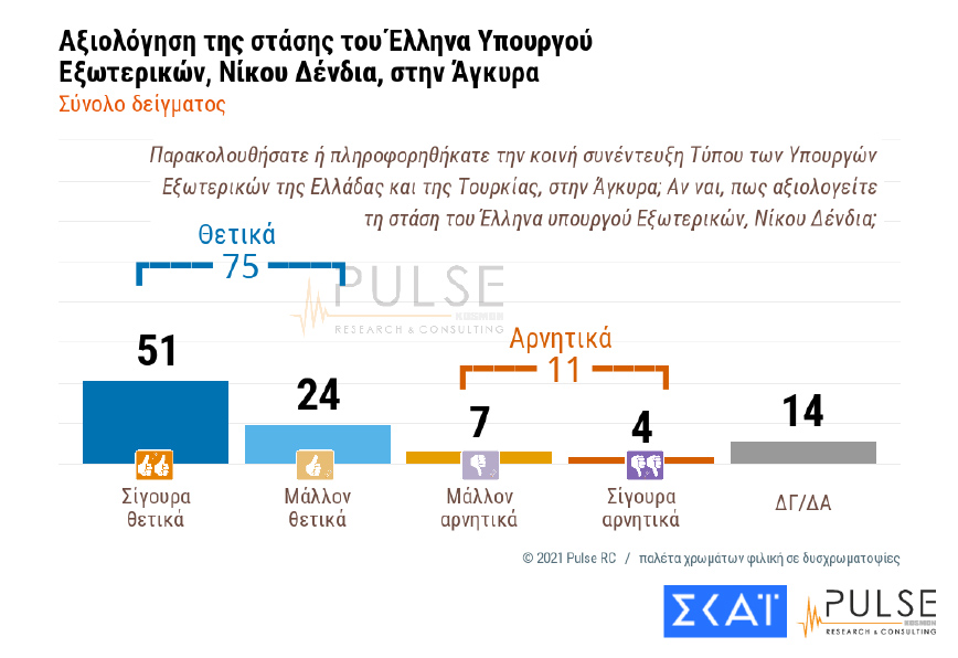 Σε ερώτηση για τον Νίκο Δένδια και την στάση του στην επίσκεψη στην Άγκυρα, το 75% είδε θετικά την παρουσία και τον τρόπο που αντιμετώπισε ο Έλληνας ΥΠΕΞ την ένταση με τον Τσαβούσογλου, ενώ το 11% αρνητικά.