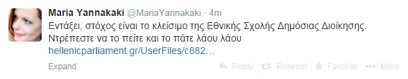 Συγκεκριμένα σχολίασε μέσω twitter: «Εντάξει, στόχος είναι το κλείσιμο της Εθνικής Σχολής Δημόσιας Διοίκησης. Ντρέπεστε να το πείτε και το πάτε λάου λάου»ενώ επισύναψε το σχετικό σχέδιο νόμου