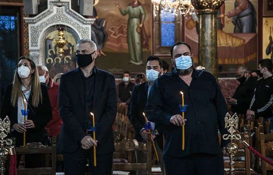 Ο ισχυρός άνδρας της ΠΑΕ Ολυμπιακός Βαγγέλης Μαρινάκης και ο δήμαρχος του Πειραιά Γιάννης Μώραλης παρακολούθησαν από κοινού το βράδυ της Μεγάλης Παρασκευής τα εγκώμια στον καθεδρικό ναό της «Αγίας Τριάδας» στον Πειραιά.