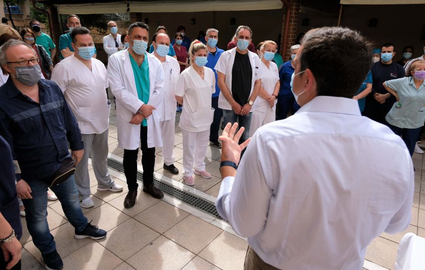 Μιλώντας με γιατρούς, νοσηλευτές, εργαζόμενους στην καθαριότητα ο πρόεδρος του ΣΥΡΙΖΑ είπε ότι αυτές τις μέρες που όλοι έχουμε ανάγκη να πάρουμε από το χαρμόσυνο μήνυμα της Ανάστασης, η σκέψη μας δεν μπορεί παρά να είναι «δίπλα στους ανθρώπους που δίνουν μάχη και δίπλα σε εσάς που τους στηρίζετε 14 μήνες τώρα, που δίνετε από το υστέρημα της δύναμης σας για να βοηθήσετε τους συνανθρώπους μας που δίνουν τη μάχη της ζωής». Σημείωσε ότι «θα πρέπει όλοι να συνειδητοποιήσουμε ότι δεν αρκούν λόγια ευγνωμοσύνης, αλλά πρέπει επιτέλους να υπάρξει και έμπρακτη στήριξη σε όλους εσάς, νοσηλευτές, γιατρούς, προσωπικό που δίνει αυτή τη μάχη». Χρειαζόμαστε, πρόσθεσε, «ένα νέο και ισχυρό ΕΣΥ που θα δίνει προτεραιότητα στους ανθρώπους του». Ο κ. Τσίπρας είπε ότι «είναι λυπηρό το γεγονός ότι 14 μήνες τώρα δεν έχει υπάρξει ουσιαστική ενίσχυση» και «ακόμα πιο λυπηρό ότι τείνουμε να συνηθίσουμε την ιδέα της απώλειας». «Την Ανάσταση τη γιορτάσαμε χτες», συνέχισε, «αλλά η συλλογική ανάσταση δεν θα έρθει από μόνη της, θα έρθει με αγώνες και διεκδικήσεις και πρέπει να μη συμβιβαστούμε στην ιδέα ότι μπορούμε να ζούμε με λιγότερα από αυτά που μας αξίζουν».