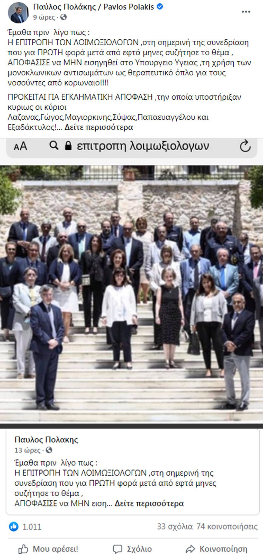ΑΠΟΦΑΣΙΣΕ να ΜΗΝ εισηγηθεί στο Υπουργειο Υγειας ,τη χρήση των μονοκλωνικων αντισωμάτων ως θεραπευτικό όπλο για τους νοσούντες από κορωναιο!!!!