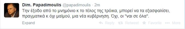 Συγκεκριμένα, ο κ. Παπαδημούλης σημείωσε χαρακτηριστικά πως «την έξοδο από το μνημόνιο κ το τέλος της τρόικα, μπορεί να τα εξασφαλίσει, πραγματικά κ όχι μαϊμού, μια νέα κυβέρνηση. Όχι, οι “ναι σε όλα”».