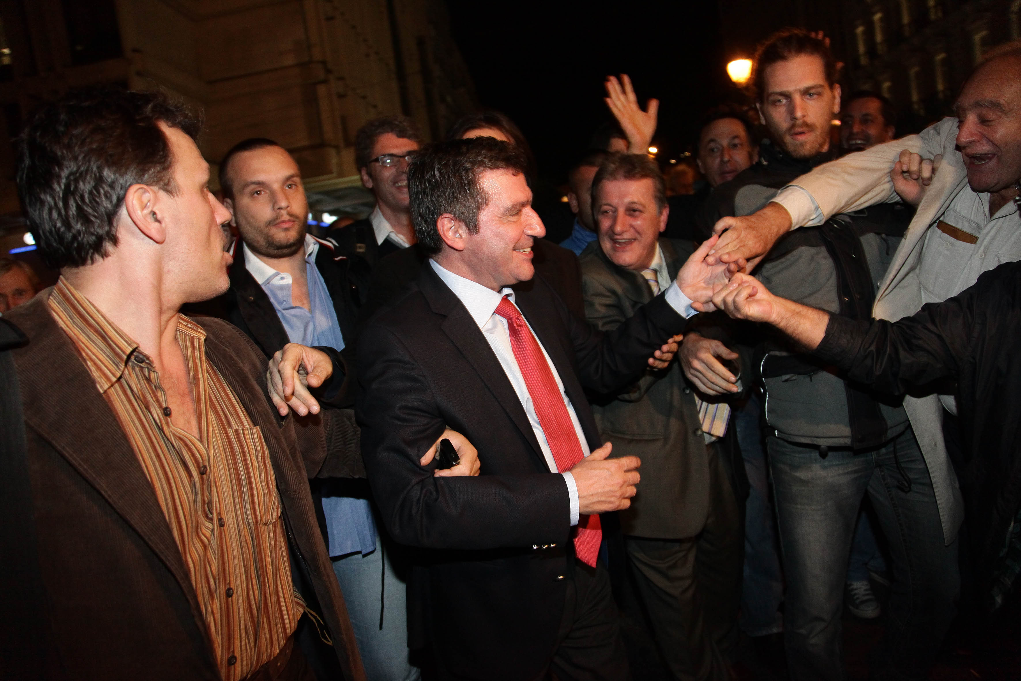 Λίγο αργότερα, στο εκλογικό κέντρο του νέου δημάρχου Αθηναίων έφτασαν ο πρωθυπουργός Γιώργος Παπανδρέου, η σύζυγός του Άντα, αλλά και ο Περιφερειάρχης Αττικής Γιάννης Σγουρός, δίνοντας το έναυσμα ν’ αρχίσουν οι πανηγυρισμοί.