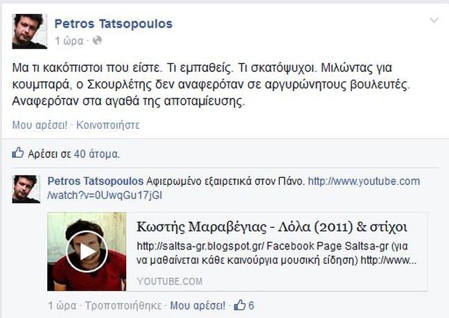 Συγκεκριμένα, σε ανάρτησή του στο Facebook ο κ. Τατσόπουλος αφιέρωσε το τραγούδι του Κωστή Μαραβέγια «Πιο χαμηλά, Λόλα»