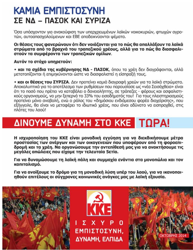 «Η ισχυροποίηση του ΚΚΕ είναι μοναδική εγγύηση για να διεκδικήσουμε μέτρα προστασίας των ανέργων και των οικογενειών που υποφέρουν από τη φοροεπιδρομή και τα χρέη, να οργανώσουμε την αντεπίθεσή μας για να ανακτήσουμε τις μεγάλες απώλειες που είχαμε την τελευταία 5ετία» τονίζεται στο φυλλάδιο του κόμματος, καλώντας σε ισχυροποίηση της λαϊκής πάλης και σε συμμαχία ενάντια στα μονοπώλια και τον καπιταλισμό, «για να ανοίξουμε το δρόμο για τη μοναδική λύση υπέρ του λαού, για να ικανοποιηθούν επιτέλους οι σύγχρονες κοινωνικές ανάγκες μας με λαϊκή εξουσία».