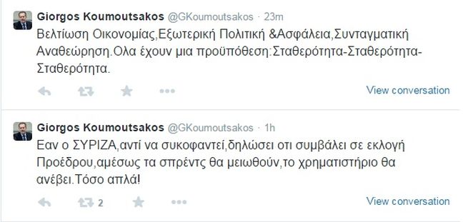 Επίθεση με το καλημέρα επεφύλασσε ο γραμματέας Στρατηγικού Σχεδιασμού και Επικοινωνίας της Νέας Δημοκρατίας, Γιώργος Κουμουτσάκος μέσω twitter, στον απόηχο του τριήμερου κραχ στο Χρηματιστήριο και την άνοδο των spreads.