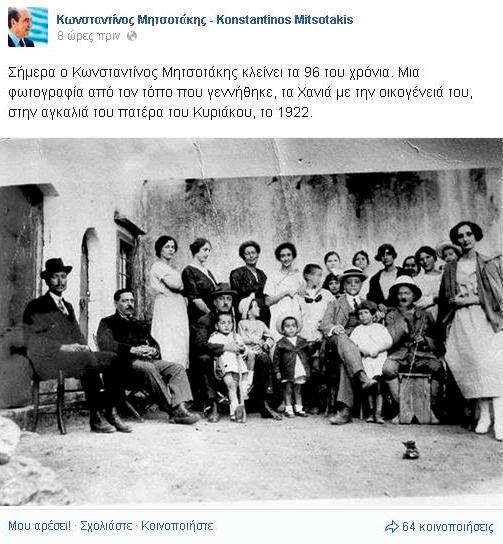 «Μια φωτογραφία από τον τόπο που γεννήθηκε, τα Χανιά με την οικογένειά του, στην αγκαλιά του πατέρα του Κυριάκου, το 1922», είναι η περιγραφή που συνοδεύει τη φωτογραφία…