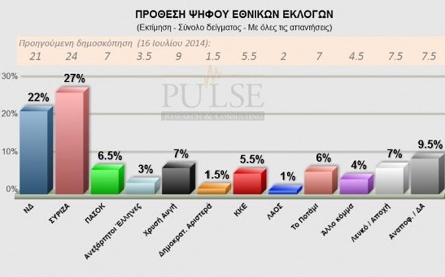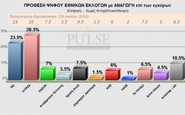 Προβάδισμα πέντε ποσοστιαίων μονάδων του ΣΥΡΙΖΑ έναντι της Ν.Δ., καταγράφει δημοσκόπηση της Pulse που δημοσιεύεται αύριο στο «Ποντίκι».