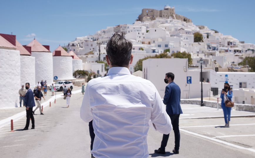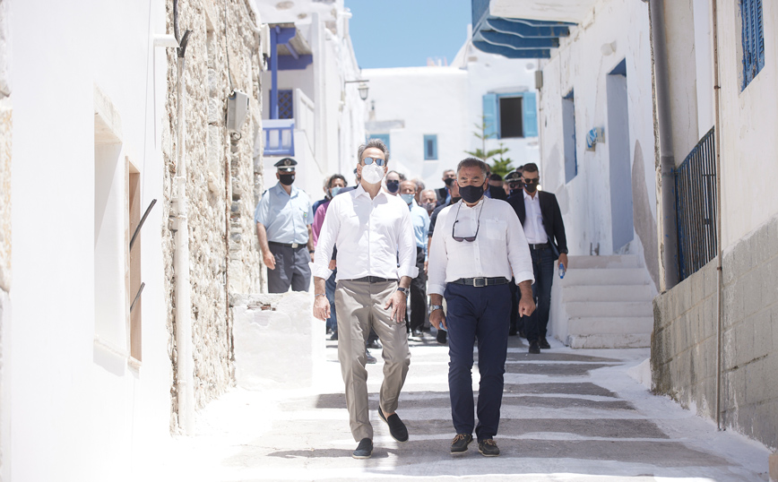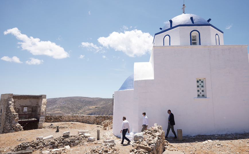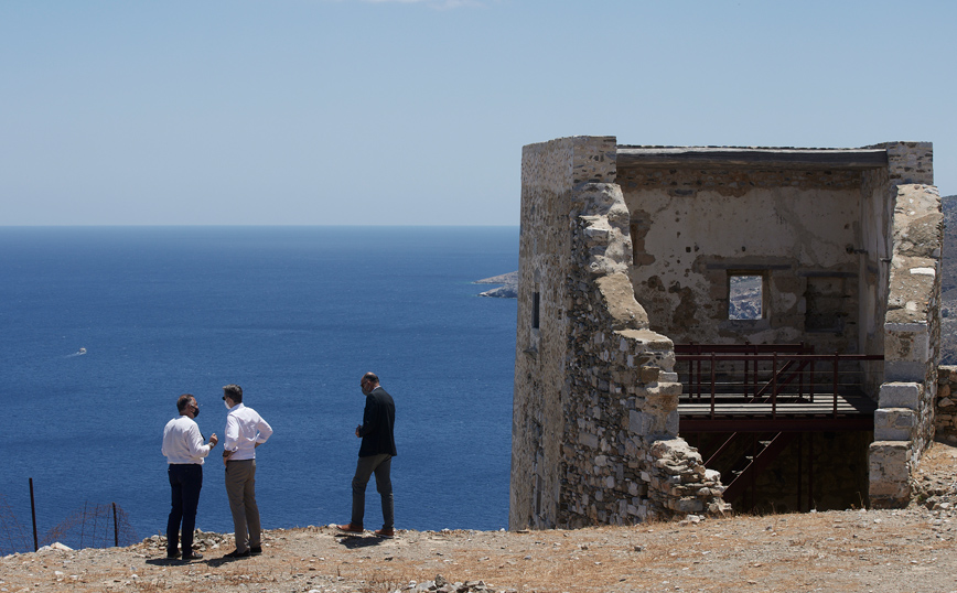 Στη συνέχεια ο Κυριάκος Μητσοτάκης, συνοδευόμενος από τον Δήμαρχο του νησιού, Νίκο Κομηνέα, περπάτησε στην περιοχή του ιστορικού Κάστρου, στη Χώρα, επισκέφθηκε τους περίφημους ανεμόμυλους, που έχουν κηρυχθεί ιστορικά διατηρητέα μνημεία και αποτελούν αναπόσπαστο στοιχείο του παραδοσιακού συστήματος καλλιέργειας δημητριακών στο νησί, ενώ συνομίλησε με πολίτες που είχαν συγκεντρωθεί και τον υποδέχτηκαν με χειροκροτήματα.