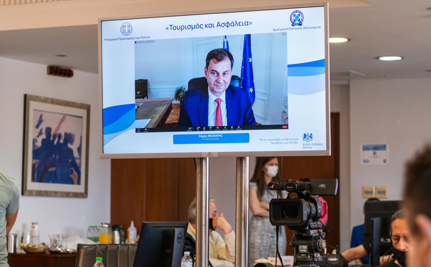 Ο Υπουργός Τουρισμού, Χάρης Θεοχάρης σημείωσε ότι η Ημερίδα γίνεται στην καλύτερη δυνατή χρονική στιγμή και τόνισε πως η διάρκεια της τουριστικής περιόδου εφέτος θα κρίνει και το τελικό αποτέλεσμα σε αφίξεις και έσοδα για τον ελληνικό τουρισμό. Επίσης, ζήτησε την αυστηρή τήρηση των υγειονομικών μέτρων και αναφέρθηκε στη σημαντική συμβολή της αστυνομίας σε αυτό. Ο κ. Θεοχάρης εξέφρασε την ικανοποίηση του για το γεγονός ότι από το άνοιγμα του ελληνικού τουρισμού υπάρχει συνεχής πτώση των κρουσμάτων και επεσήμανε ότι «θα πρέπει να είμαστε περήφανοι για το γεγονός ότι η Ελλάδα έχει σχέδιο και το θέτει σε εφαρμογή».