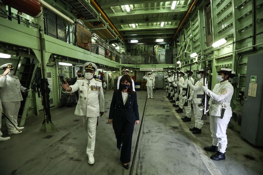 Η κ. Σακελλαροπούλου επιβιβάστηκε στη φρεγάτα «ΥΔΡΑ», όπου την υποδέχθηκαν ο υπουργός Εθνικής ‘Αμυνας Νικόλαος Παναγιωτόπουλος, ο υφυπουργός Εθνικής ‘Αμυνας Αλκιβιάδης Στεφανής, ο αρχηγός ΓΕΕΘΑ Στρατηγός Κωνσταντίνος Φλώρος, ο αρχηγός ΓΕΝ Αντιναύαρχος Στυλιανός Πετράκης, ο αρχηγός Στόλου Αντιναύαρχος Παναγιώτης Λυμπέρης, τα μέλη του Ανώτατου Ναυτικού Συμβουλίου και ο κυβερνήτης της φρεγάτας αντιπλοίαρχος Διονύσης Αρτεμάκης. Όπως τόνισε «εθνική υπερηφάνεια είναι το αίσθημα που κυριαρχεί μετά την επιθεώρηση του Στόλου. Υπερηφάνεια και σεβασμός προς τους άνδρες και τις γυναίκες του Πολεμικού μας Ναυτικού, που υπηρετούν το έθνος με αφοσίωση, υψηλό φρόνημα και αυταπάρνηση». Παράλληλα, υπογράμμισε ότι «οι σύγχρονοι Θεμιστοκλείς υπερασπίζονται με αποτελεσματικότητα τα θαλάσσια σύνορα της πατρίδας μας και της Ευρώπης απέναντι σε προκλήσεις και απειλές της εθνικής μας ακεραιότητας, όπως το καλοκαίρι του 2020, διασφαλίζοντας τα κυριαρχικά μας δικαιώματα. Τους είμαστε ευγνώμονες για την προσφορά τους».