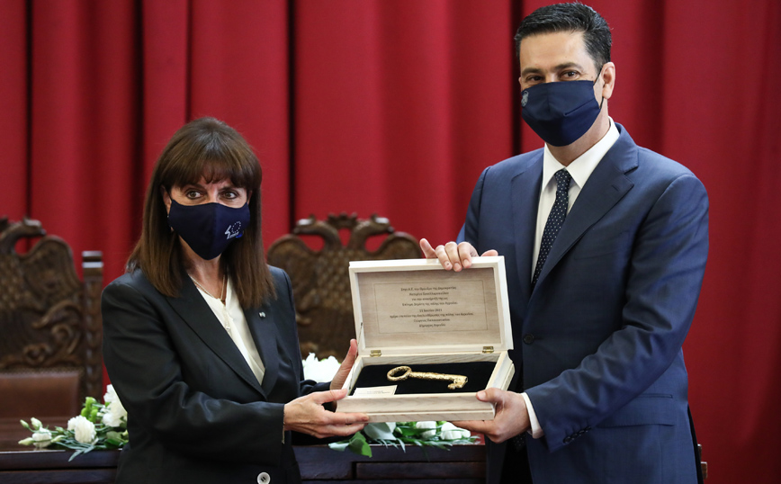 Στη συνέχεια, η κ. Σακελλαροπούλου μετέβη στην αίθουσα του Δημοτικού Συμβουλίου, όπου ανακηρύχθηκε επίτιμη δημότης του Δήμου Αγρινίου και της επιδόθηκε το χρυσό κλειδί της πόλης.
