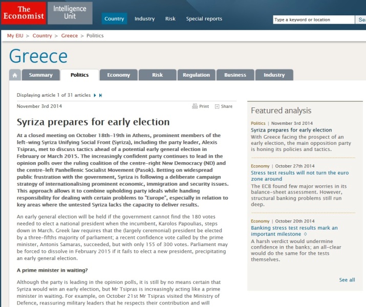 Τις πολιτικές κινήσεις του ΣΥΡΙΖΑ εν όψει ενδεχόμενων πρόωρων εκλογών τον ερχόμενο Μάρτιο με αφορμή την προεδρική εκλογή σκιαγραφεί το περιοδικό The Economist, σε άρθρο του με τον τίτλο «Ο ΣΥΡΙΖΑ ετοιμάζεται για πρόωρες εκλογές». Όπως σημειώνεται, «αν και το κόμμα προηγείται στις δημοσκοπήσεις, δεν είναι ακόμα καθόλου βέβαιο ότι ο ΣΥΡΙΖΑ θα κέρδιζε σε πρόωρες εκλογές, αλλά ο κ. Τσίπρας όλο και περισσότερο συμπεριφέρεται σαν πρωθυπουργός εν αναμονή».