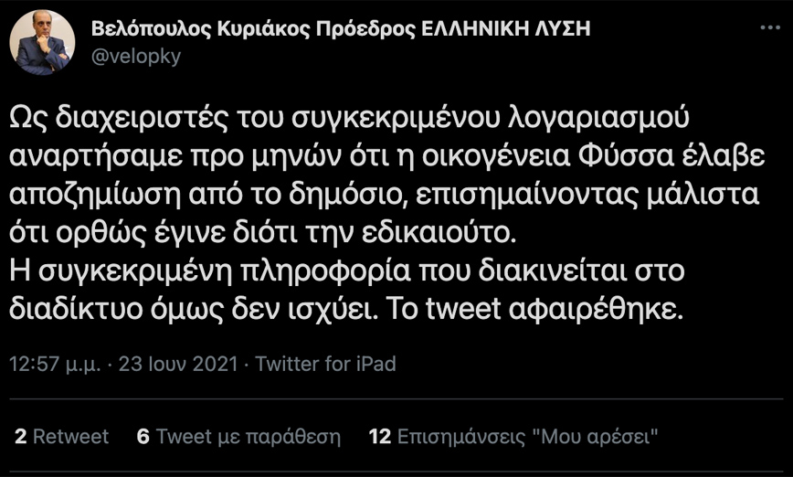 Μάλιστα στον λογαριασμό του κ. Βελόπουλου στο εν λόγω μέσο κοινωνικής δικτύωσης έγιναν δύο νέες αναρτήσεις. Η πρώτη αναφέρει: «Ως διαχειριστές του συγκεκριμένου λογαριασμού αναρτήσαμε προ μηνών ότι η οικογένεια Φύσσα έλαβε αποζημίωση από το δημόσιο, επισημαίνοντας μάλιστα ότι ορθώς έγινε διότι την εδικαιούτο. Η συγκεκριμένη πληροφορία που διακινείται στο διαδίκτυο όμως δεν ισχύει. Το tweet αφαιρέθηκε».