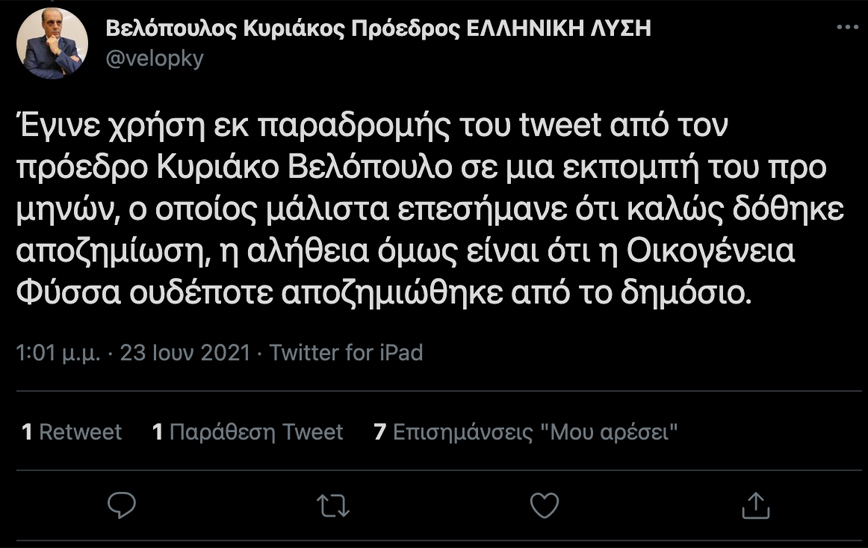 Τα μάζεψε ο πρόεδρος της «Ελληνικής Λύσης» Κυριάκος Βελόπουλος μετά την έντονη αντίδραση της μητέρας του δολοφονημένου Παύλου Φύσσα, Μάγδας, η οποία αναγκάστηκε να στείλει επιστολή στον Πρόεδρο της Βουλής διαμαρτυρόμενη για το γεγονός ότι ο επικεφαλής του κόμματος της ελάσσονος αντιπολίτευσης ανέφερε δημοσίως, μέσω tweet, ότι η ίδια είχε λάβει αποζημίωση από το ελληνικό Δημόσιο ύψους 800.000 ευρώ.