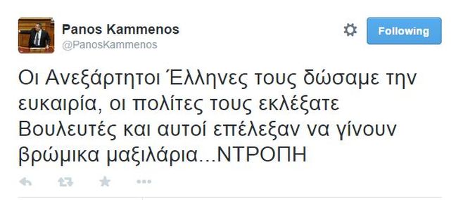 Το πρωί της Πέμπτης ο Πάνος Καμμένος μέσω twitter έκανε λόγο για «βρώμικα μαξιλάρια» και σημείωσε χαρακτηριστικά πως «Οι Ανεξάρτητοι Έλληνες τους δώσαμε την ευκαιρία, οι πολίτες τους εκλέξατε Βουλευτές και αυτοί επέλεξαν να γίνουν βρώμικα μαξιλάρια… ΝΤΡΟΠΗ».
