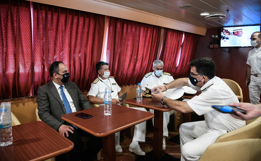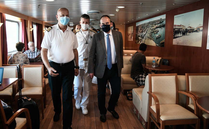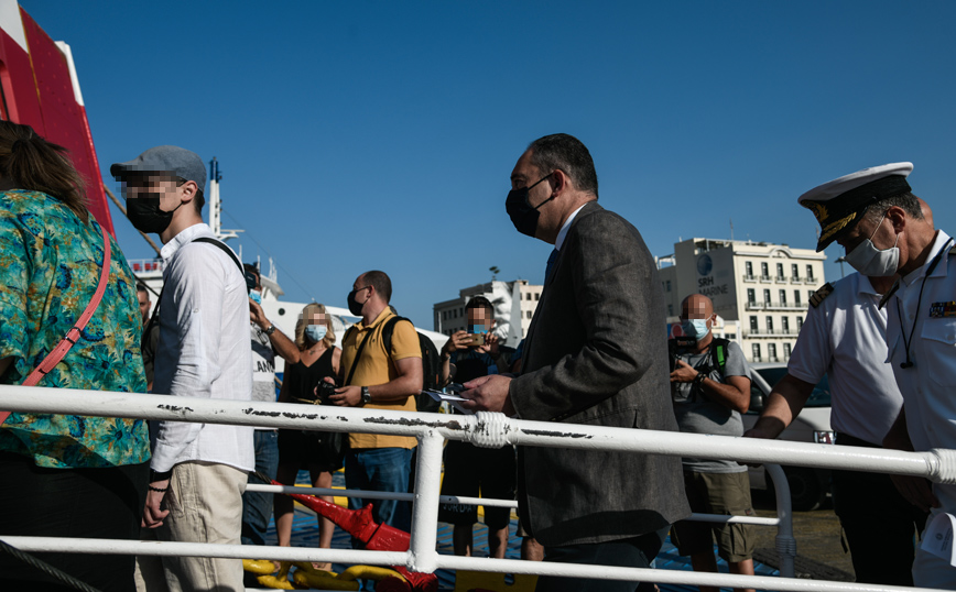 Στη συνέχεια, ο υπουργός επιβιβάστηκε σε πλοίο που εκτελεί το δρομολόγιο Αίγινα-Μέθανα-Πόρο προκειμένου να επιθεωρήσει την εφαρμογή των μέτρων και εν πλω. Μάλιστα, ο ίδιος δεν απέφυγε τον έλεγχο, παρά την ιδιότητά του, και επέδειξε τα απαραίτητα έγγραφα πριν την επιβίβασή του.