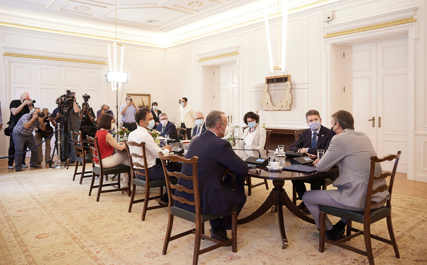 Με τον Πρόεδρο του Eurogroup και Υπουργό Οικονομικών της Ιρλανδίας Paschal Donohoe συναντήθηκε στο Μέγαρο Μαξίμου ο πρωθυπουργός, Κυριάκος Μητσοτάκης, παρουσία του Υπουργού Οικονομικών Χρήστου Σταϊκούρα, της Κυβερνητικήσ Εκπροσώπου Αριστοτελίας Πελώνη και του προϊσταμένουτ ου Οικονομικού Γραφείου του Πρωθυπουργού Αλέξη Πατέλη.