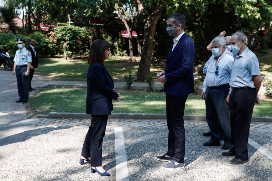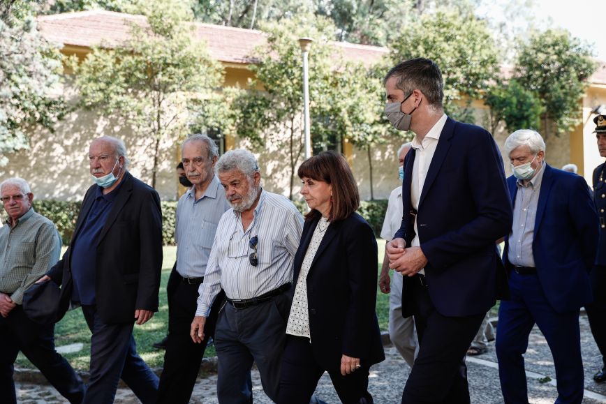 Την κυρία Σακελλαροπούλου υποδέχθηκαν ο Δήμαρχος Αθηναίων Κώστας Μπακογιάννης και ο Πρόεδρος του Συνδέσμου Φυλακισθέντων και Εξορισθέντων Αντιστασιακών 1967-1974 Ευάγγελος Γκιουγκής.