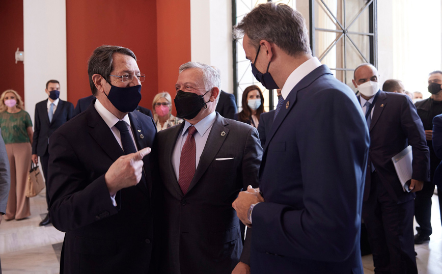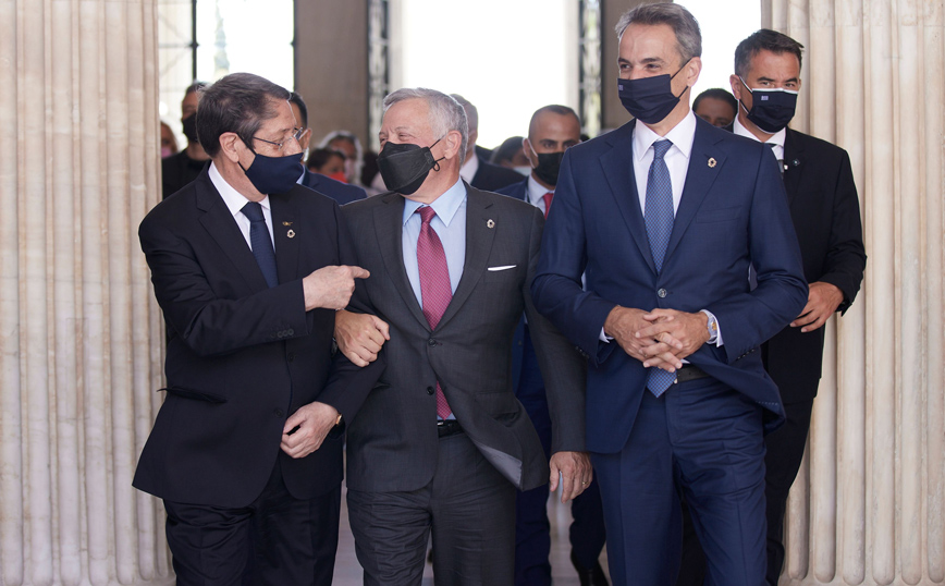 «Η σημερινή Σύνοδος Κορυφής αντανακλά την δέσμευση των χωρών μας για την προώθηση της ειρήνης, της σταθερότητας και της ευημερίας στην ευρύτερη περιοχή. Θα μας δώσει τη δυνατότητα να ανοίξουμε τον δρόμο για έναν ταχύτερο συντονισμό των δράσεών μας προς όφελος των λαών μας και προς όφελος της ευρύτερης περιοχής», ανέφερε ο Κυριάκος Μητσοτάκης στην εισαγωγική του τοποθέτηση στην τριμερή Σύνοδο Κορυφής Ελλάδας-Κύπρου-Ιορδανίας στο Ζάππειο Μέγαρο.