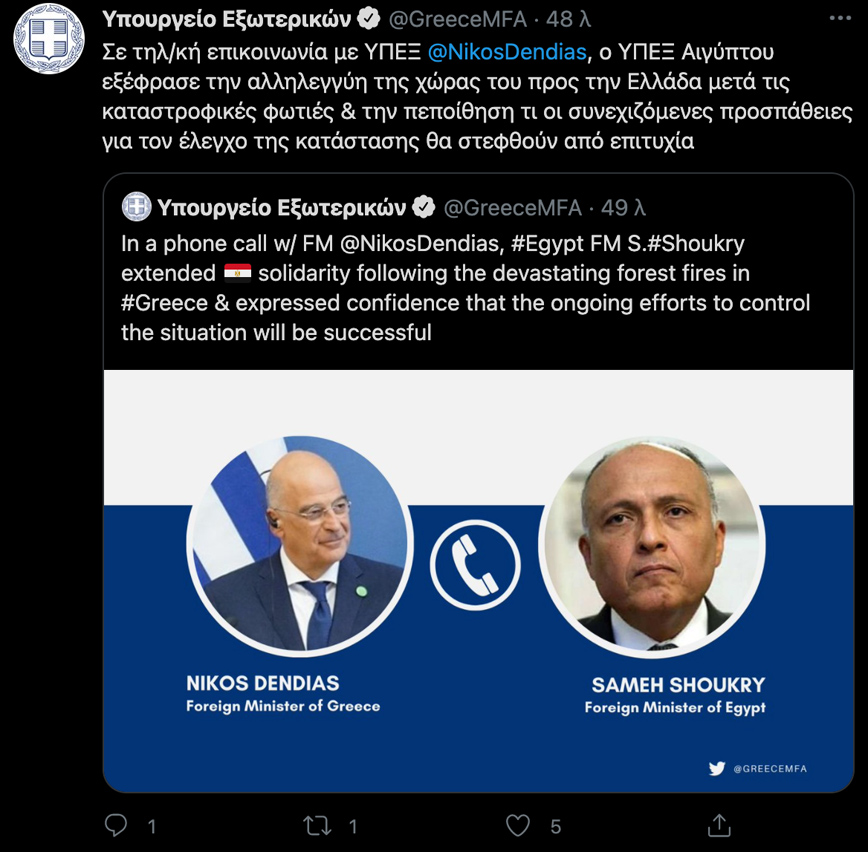 Με τον Έλληνα υπουργό Εξωτερικών Νίκο Δένδια επικοινώνησε τηλεφωνικά το πρωί της Πέμπτης ο Αιγύπτιος ΥΠΕΞ, Σαμέχ Σούκρι, για να του εκφράσει την αλληλεγγύη της χώρας του για τις πυρκαγιές που εκδηλώθηκαν ανά την επικράτεια.