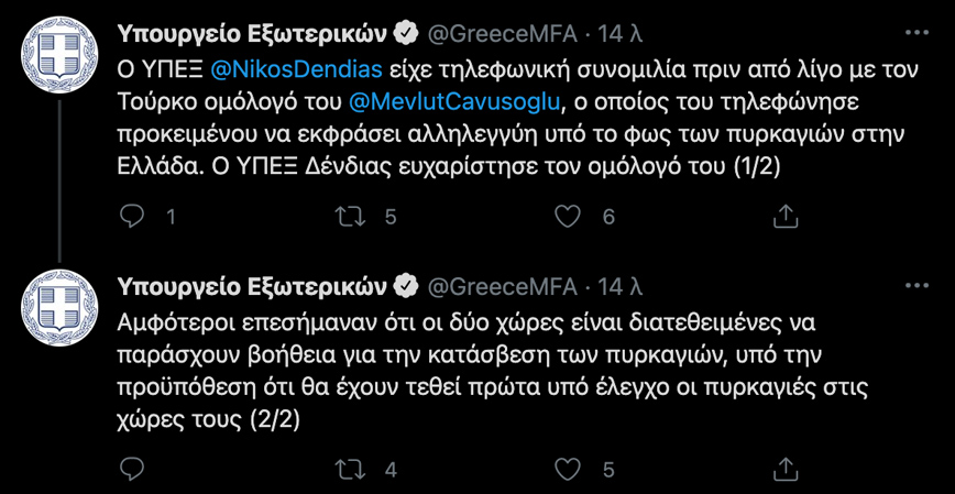Σύμφωνα με το σχετικό tweet που ανέβασε στον λογαριασμό του το ΥΠΕΞ της χώρας μας, η πρωτοβουλία του τηλεφωνήματος ανήκε στον κ. Δένδια που «εξέφρασε την αλληλεγγύη υπό το φως των πυρκαγιών στην Ελλάδα». Παράλληλα «αμφότεροι επεσήμαναν ότι οι δύο χώρες είναι διατεθειμένες να παράσχουν βοήθεια για την κατάσβεση των πυρκαγιών, υπό την προϋπόθεση ότι θα έχουν τεθεί πρώτα υπό έλεγχο οι πυρκαγιές στις (σ.σ. δικές τους) χώρες», που έχουν προκαλέσει πολλά και σημαντικά προβλήματα.