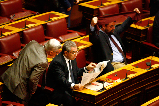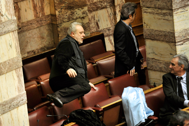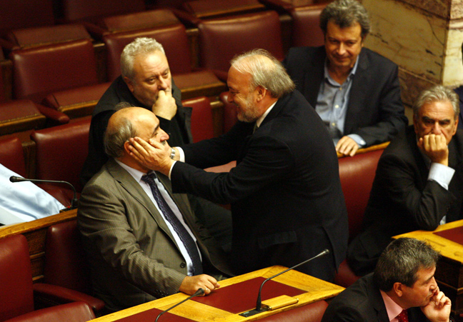 Ο πρόεδρος του ΠΑΣΟΚ, Ευάγγελος Βενιζέλος, βρέθηκε στην Ολομέλεια ένα λεπτό μετά τον πρωθυπουργό και κάθισε δίπλα στον πρώην πρόεδρο της Βουλής, Απόστολο Κακλαμάνη.