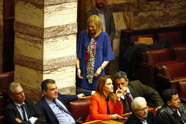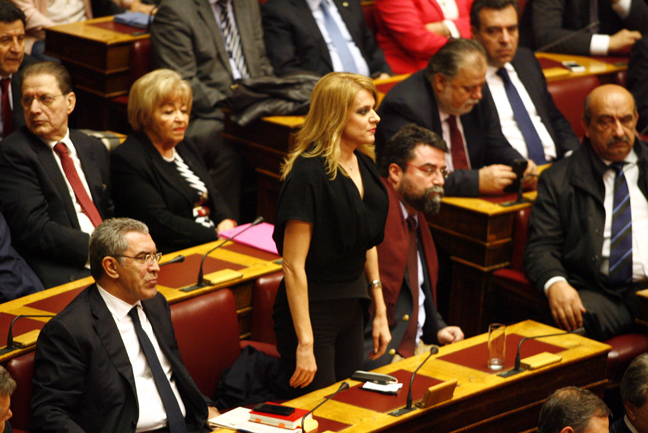 Η πρώην υπουργός της ΝΔ, Ντόρα Μπακογιάννη, επισκέφθηκε στο έδρανο της την Αλέκα Παπαρήγα και είχαν μια πεντάλεπτη συνομιλία με παρούσα και τη Λιάνα Κανέλη.
