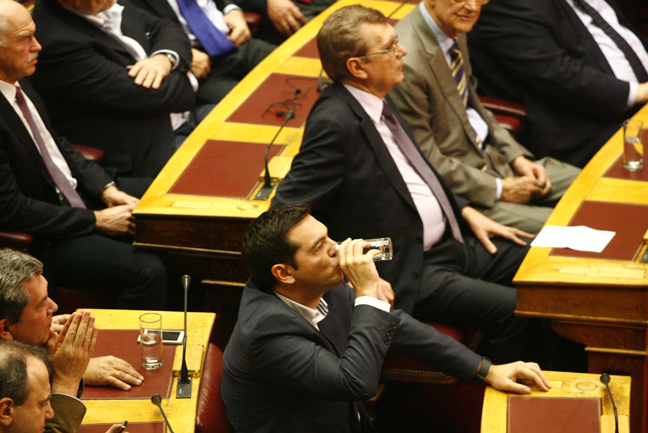 Πρώτος πάντως από τους πολιτικούς αρχηγούς κάθισε στα έδρανα ο αρχηγός των ΑΝ.ΕΛ., Πάνος Καμμένος, ο οποίος έφθασε στην Ολομέλεια στις 7:00 ακριβώς, ενώ η γραμματέας της Κοινοβουλευτικής Ομάδας του ΚΚΕ, Αλέκα Παπαρήγα, μπήκε πέντε λεπτά αργότερα.