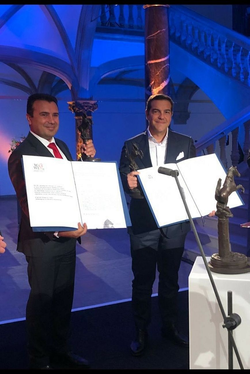 Το βραβείο Βεστφαλίας έλαβαν από κοινού Αλέξης Τσίπρας και Ζόραν Ζάεφ, για την κοινή τους επιτυχία να επιλυθεί με ειρηνικό τρόπο το ονοματολογικό της νυν Βόρειας Μακεδονίας.