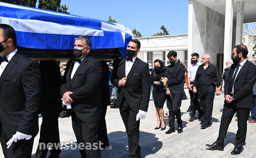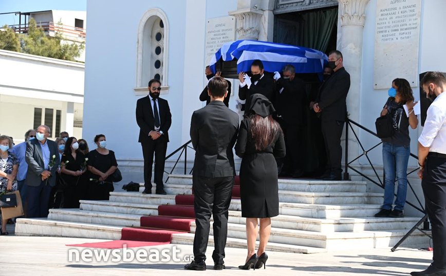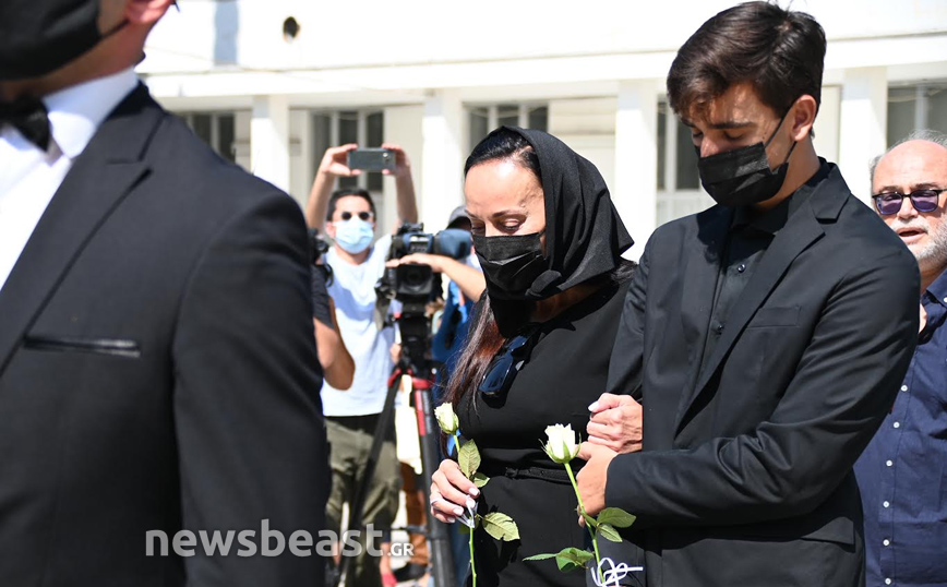 Η σύζυγός του Βίκυ Σταμάτη, η γυναίκα που έμεινε στο πλευρό του πρώην ισχυρού άνδρα του ΠΑΣΟΚ για 17 χρόνια, φορώντας μαύρη μαντήλα στο κεφάλι και κρατώντας ένα λευκό τριαντάφυλλο ακολουθεί συντετριμμένη το φέρετρο, έχοντας στο πλευρό της τον γιο της.
