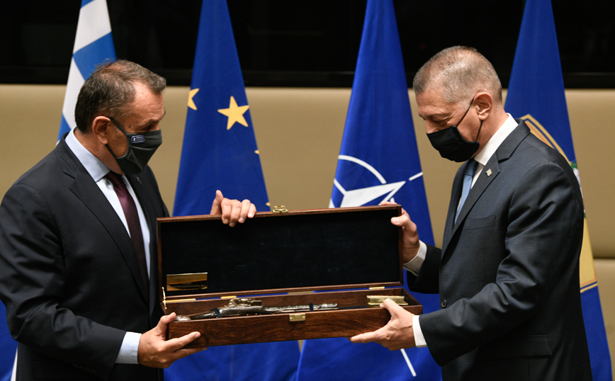 Μετά την τελετή, ο Αλκιβιάδης Στεφανής δέχθηκε δώρα από την πολιτική και στρατιωτική ηγεσία του υπουργείου Εθνικής ‘Αμυνας.