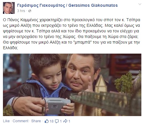 Σε αυτά προστίθεται και το σχόλιο του Γεράσιμου Γιακουμάτου, ο οποίος σε ανάρτησή του στο Facebook χαρακτηρίζει τον Πάνο Καμμένο «μπαμπά» του Αλέξη Τσίπρα και καλεί τους πολίτες να αναρωτηθούν αν θα ψηφίσουν Τσίπρα και Καμμένο για να παίζουν με την Ελλάδα.
