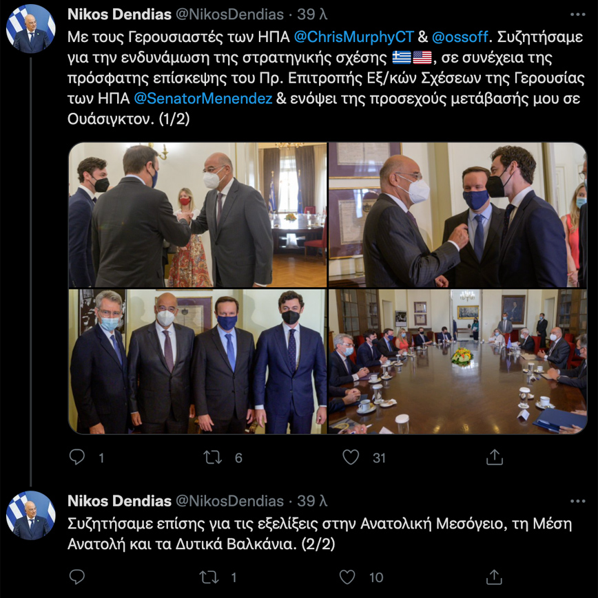 Σε αυτό το πλαίσιο θα ήταν πολύ ενδιαφέρον να συζητήσουμε μαζί σας και να ακούσουμε τις απόψεις σας για την κατάσταση στη Μεσόγειο καθώς και να ανταλλάξουμε απόψεις για το μέλλον». Μάλιστα ανέβασε και σχετικό κείμενο στο Twitter συνοδευόμενο από φωτογραφικό υλικό της συνάντησης με τους Αμερικανούς επισκέπτες στο Υπουργείο Εξωτερικών.