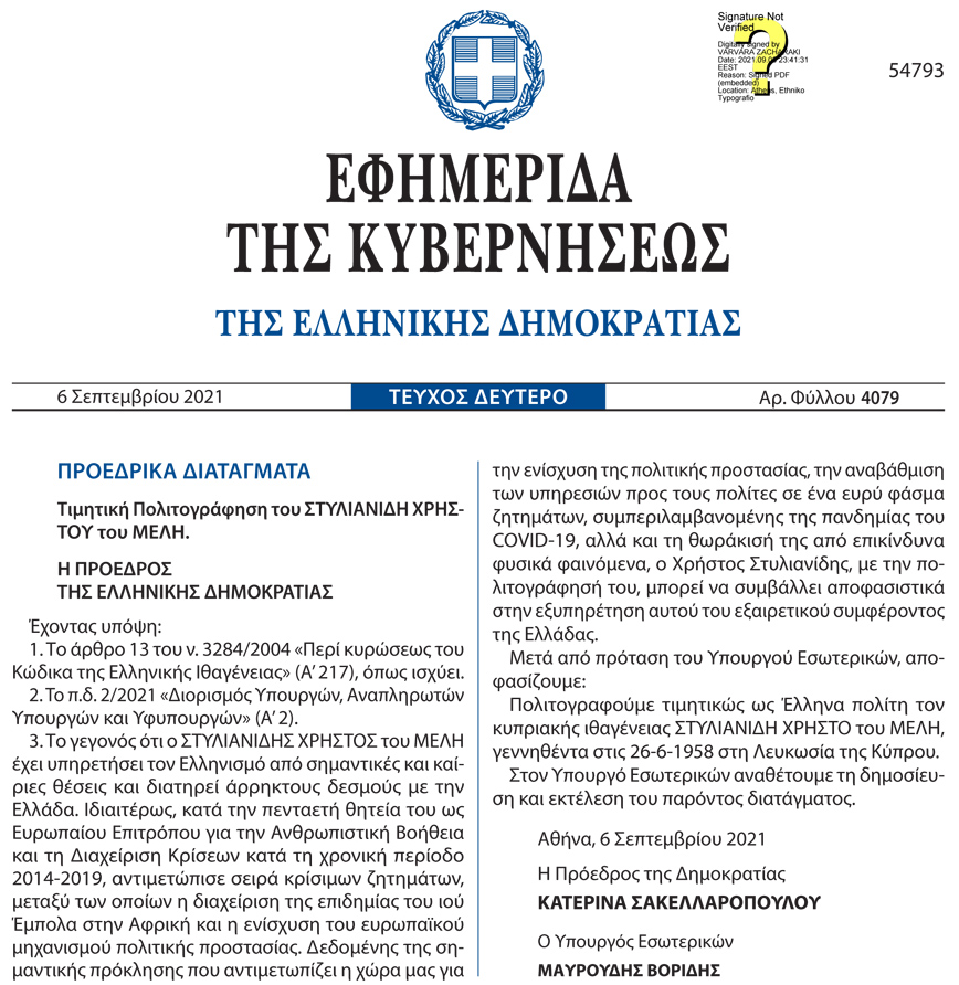 Μετά από πρόταση του Υπουργού Εσωτερικών, αποφασίζουμε: Πολιτογραφούμε τιμητικώς ως Έλληνα πολίτη τον κυπριακής ιθαγένειας ΣΤΥΛΙΑΝΙΔΗ ΧΡΗΣΤΟ του ΜΕΛΗ, γεννηθέντα στις 26-6-1958 στη Λευκωσία της Κύπρου.
