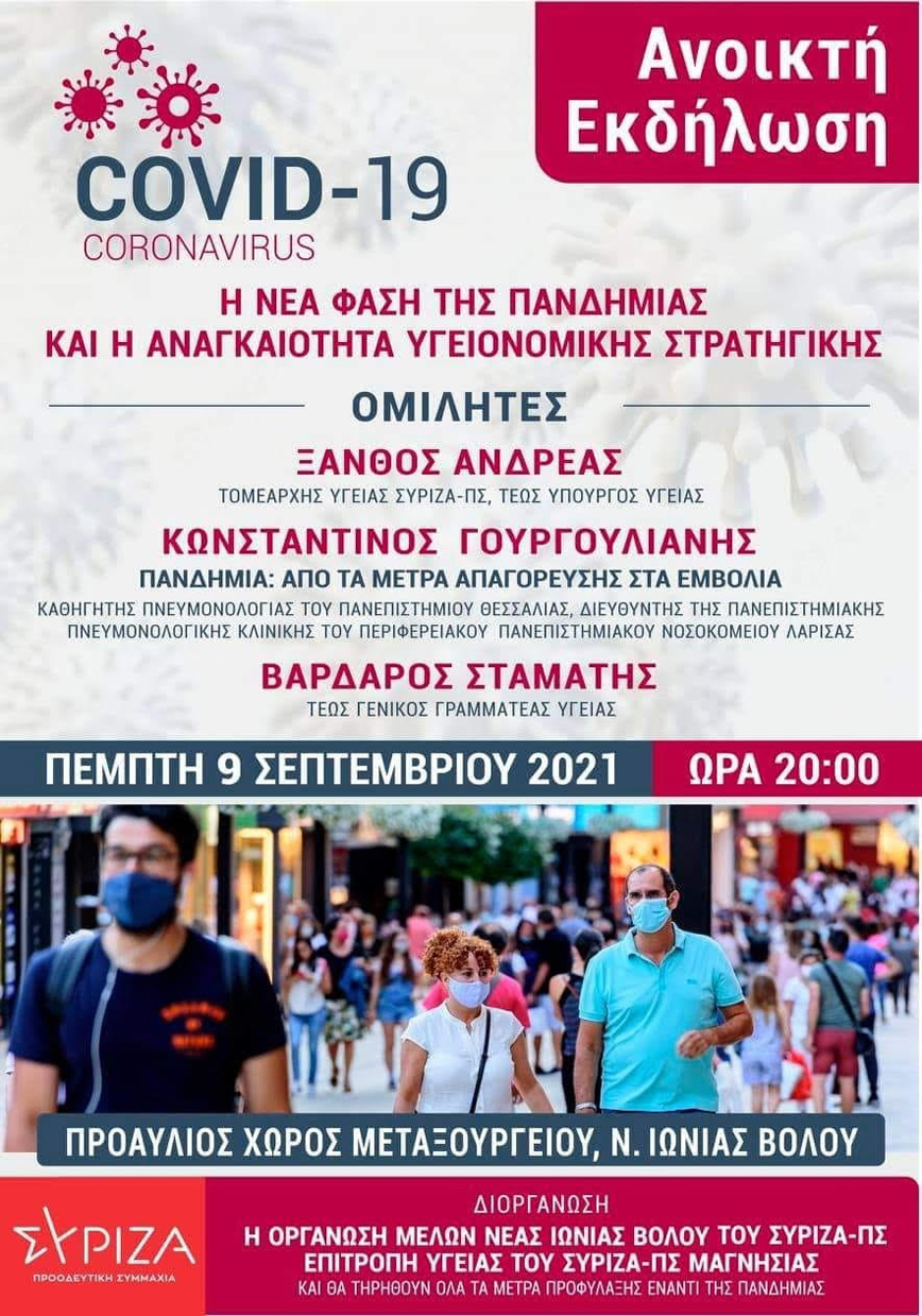 Στο πλαίσιο αυτό αύριο ο βουλευτής θα μεταβεί στον Βόλο προκειμένου να λάβει μέρος ως κεντρικός ομιλητής σε ανοικτή εκδήλωση με θέμα «Η νέα φάση της πανδημίας και η αναγκαιότητα υγειονομικής στρατηγικής», ενώ μαζί του θα βρίσκονται επίσης ο καθηγητής πνευμονολογίας του πανεπιστημίου Θεσσαλίας και διευθυντής της πανεπιστημιακής πνευμονολογικής κλινικής του περιφερειακού πανεπιστημιακού νοσοκομείου Λάρισας Κωνσταντίνος Γουργουλιάνης, καθώς επίσης και ο τέως γενικός γραμματέας Υγείας, Σταμάτης Βαρδαρός.