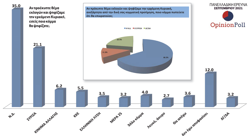 Ειδικότερα, η Νέα Δημοκρατία προηγείται με 13,9% έναντι του ΣΥΡΙΖΑ ενώ τρίτο κόμμα αναδεικνύεται το Κίνημα Αλλάγης. Στο ερώτημα «Αν προέκυπτε θέμα εκλογών και ψηφίζαμε την ερχόμενη Κυριακή, εσείς ποιο κόμμα θα ψηφίζατε;» το 35% απαντά ΝΔ και το 21,1% ΣΥΡΙΖΑ.