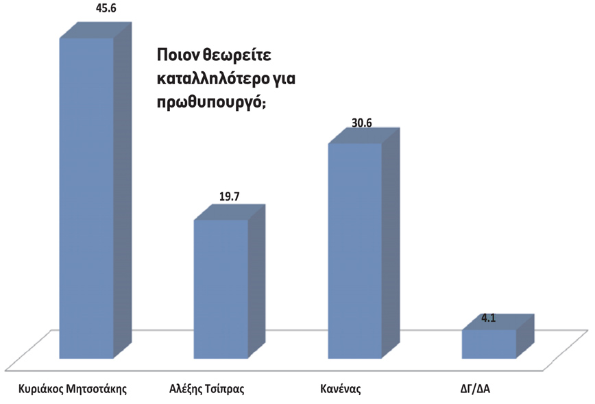 Καταλληλότερος για πρωθυπουργός αναδεικνύεται με διαφορά ο Κυριάκος Μητσοτάκης, που συγκεντρώνει 45,6% της προτίμησης των ερωτηθέντων ενώ ο πρόεδρος του ΣΥΡΙΖΑ, Αλέξης Τσίπρας μόλις 19,7%, σημαντικά μικρότερο ποσοστό από το 30,6% των συμμετεχόντων που επιλέγουν τον «κανέναν».